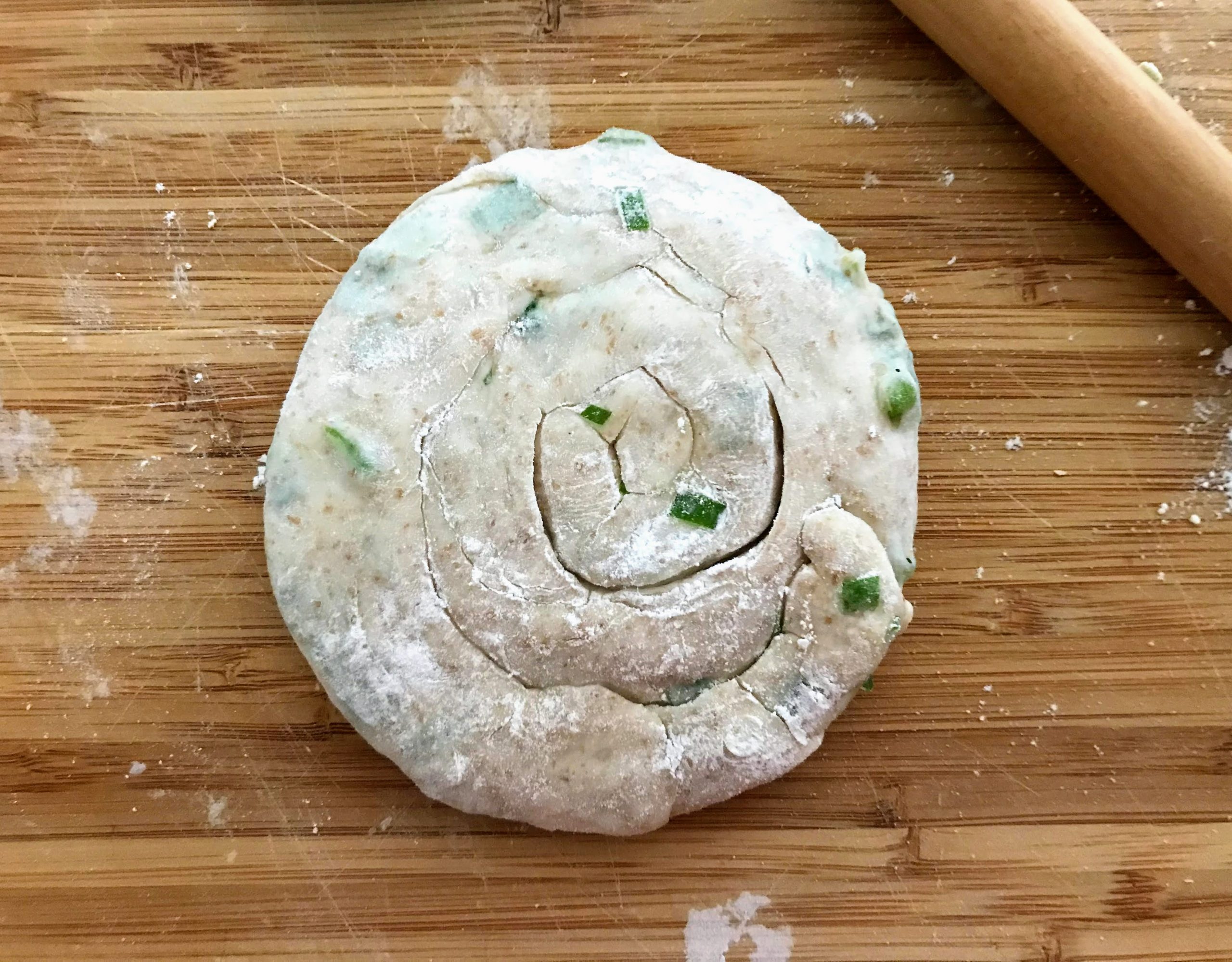 - Gently roll out the spiral into a 1/4" disk, make sure not to push too heavily onto the dough otherwise the scallions and the oil will leak out from the cracks.