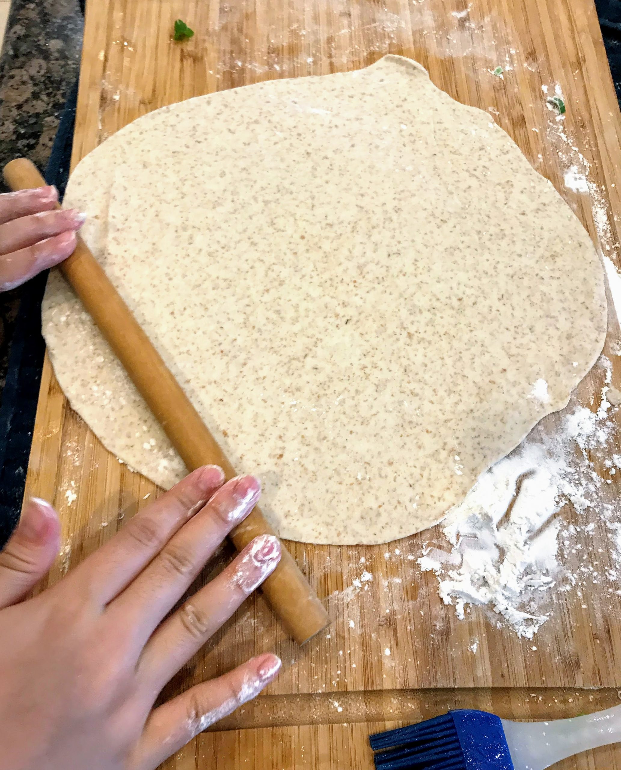 - Roll out the dough as thin as possible — thinner the more pancake layers.