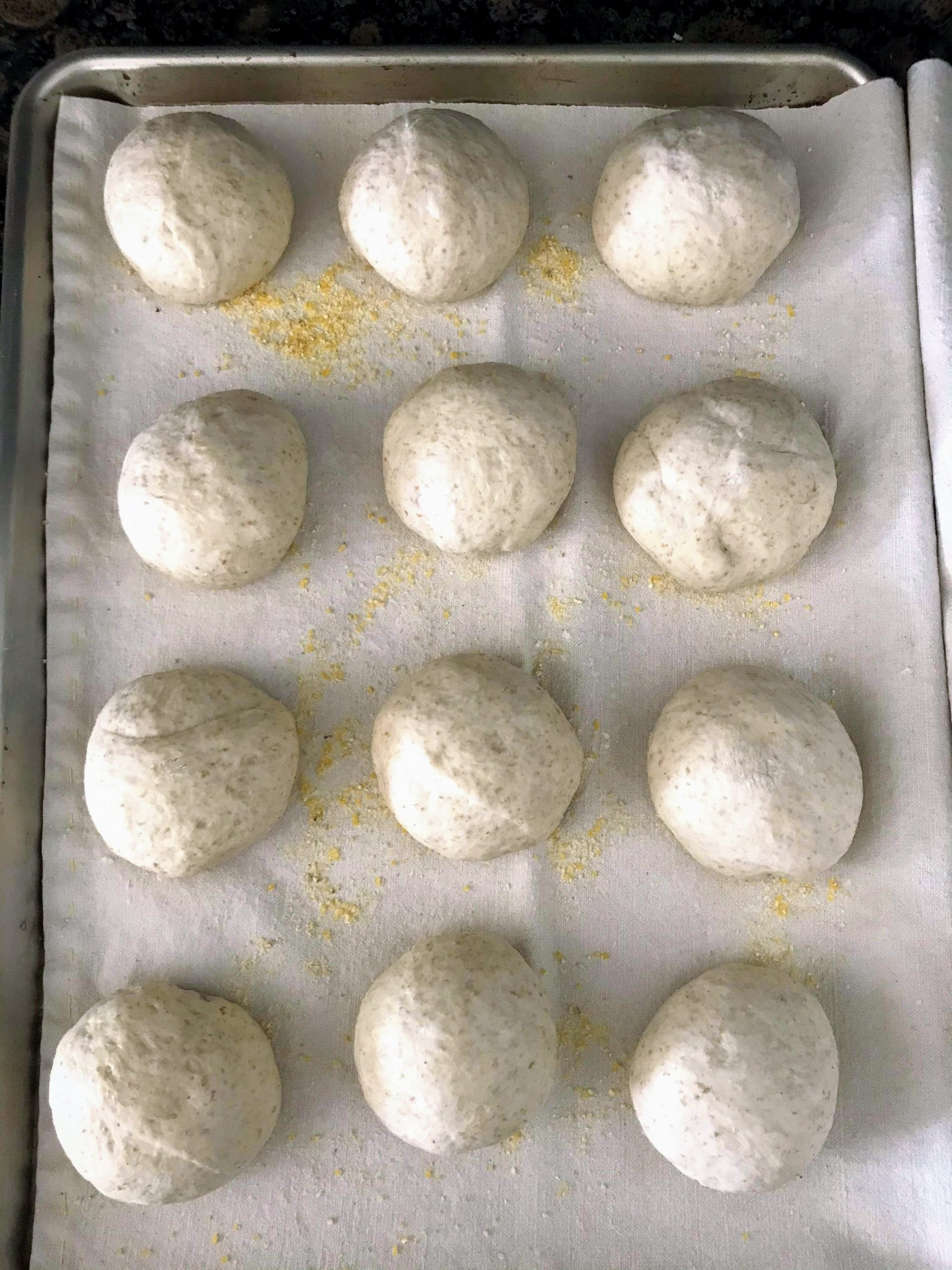 - Next, roll the dough pieces into balls, place them on a cornmeal-dusted surface, and cover with a towel and let it rest for 20 minutes.