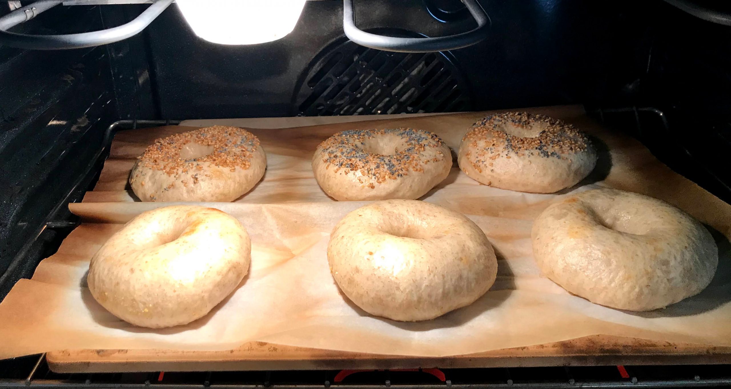 - When all six bagels are done boiling, cooling, and topping, slide the six bagels and the parchment paper onto the baking stone. Or, place the baking tray on the middle rack of the oven. Then generously spray water into the hot oven to create steam while baking the bagels. And bake for 10 minutes.